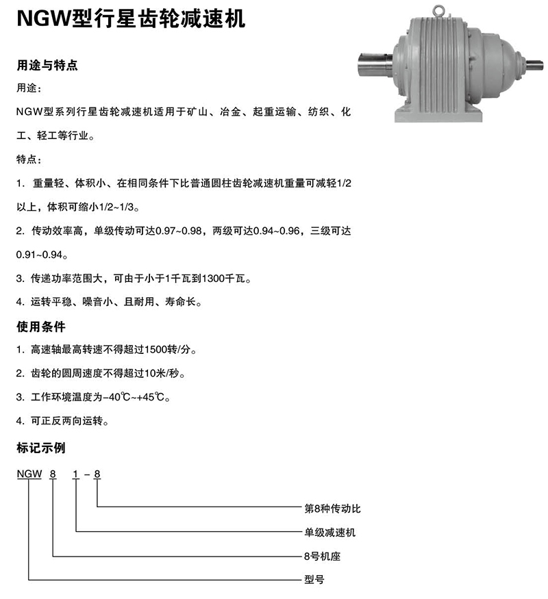 NGW型係列行星齒輪減速(sù)機適用(yòng)於礦山、冶金、起重運輸、紡織(zhī)、化工、輕工等行業(yè)。