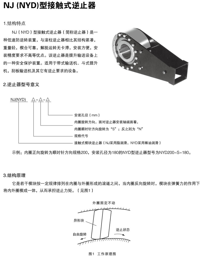 NJ (NYD)型接觸式逆止器(簡稱逆止器)是一種低速防逆轉裝置(zhì),與滾柱逆(nì)止器(qì)相(xiàng)比其結構緊湊重量輕,楔合可靠,解(jiě)脫運(yùn)轉無卡滯,安(ān)裝方便,安裝精度要求不高等優點。該逆止器是提升輸送設備上的一種安全保護裝置(zhì)。適用於(yú)帶式輸送機、鬥式提升機(jī),刮板輸送機及其它有逆止要求的設備。